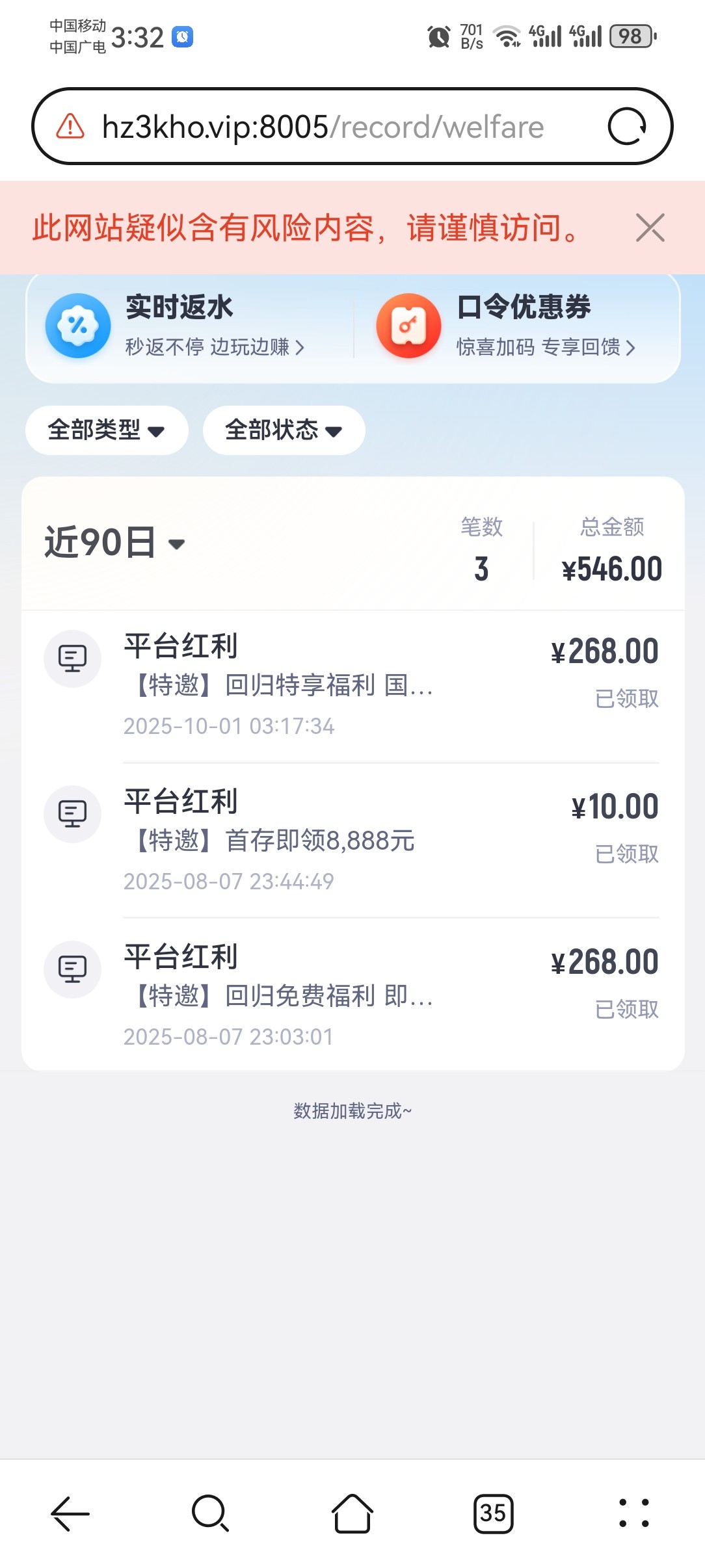 我是有次打电话来说有彩金,然后上去领了8,然后看到充值100直升v2就冲了,然后就没再充值过,然后现在v2每60天可以领取一次268